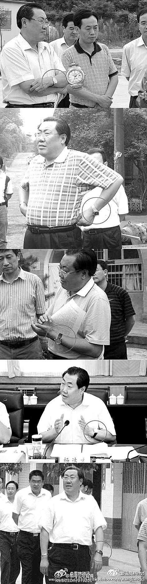 人肉搜索的大幕隨即開啟。當(dāng)日19時53分,網(wǎng)友“百姓大于天”在其微博爆料稱,涉事官員為時任陜西省安監(jiān)局局長楊達才。22時29分,網(wǎng)友“衛(wèi)莊”在其微博發(fā)布了一張楊達才佩戴手表的照片,并稱“網(wǎng)友懷疑是價值3.8萬多歐元的歐米茄”。23時57分,渤海論壇的新浪官方微博發(fā)布了楊達才在不同場合佩戴有5塊不同款式手表的照片,稱這是“陜西省安監(jiān)局局長楊達才同志的愛好”。8月27日18時12分,第五大道奢侈品網(wǎng)首席運營官孫多菲在其微博中稱:“我已向表行業(yè)內(nèi)專家請教:第一張:6.5萬元左右的蠔式恒動系列勞力士;第二張:3.4萬元至3.5萬元之間的歐米茄;第三張:江詩丹頓18K玫瑰金表殼,而且是機械的,市場估計在20萬元至40萬元;第四張:歐米茄,價格也就3萬多元到4萬元;第五張:雷達全陶瓷,市值估計3萬元。”這條微博被轉(zhuǎn)發(fā)14531次,引發(fā)評論5350條。楊達才因此也被網(wǎng)民戲稱為“表哥”!