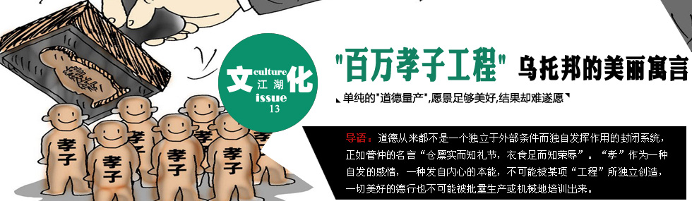 有人說,用“小孝子工程”激活“大孝道建設”;“小孝子工程”在行動,但不能讓小孝子工程“一個人戰(zhàn)斗”。這句話說得很好。如果我們用積極的眼光看待百萬小孝子工程計劃,就應該意識到我們成人世界道德建設的緊迫性和嚴峻性。依靠長期潛移默化的影響,使“孝”作為一種自發(fā)的感情,一種發(fā)自內(nèi)心的本能,被自然而然地表達出來。那效果,遠比機械制造出來“孝子”好多了。