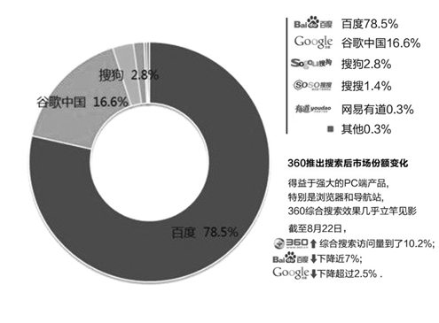 略顯簡(jiǎn)陋的360綜合搜索,輕易地?fù)艹隽艘蝗i漪,同為借勢(shì)瀏覽器的搜狗趕緊拋出“亦敵亦友”的論調(diào),百度看似坐懷不亂,卻遭遇股價(jià)一周下跌13 .6%。搜索領(lǐng)域“3BS大戰(zhàn)”一觸即發(fā),外來(lái)軍谷歌躺著中槍。