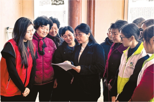 2025年3月,丁德芬(左五)在安徽省東至縣堯渡鎮(zhèn)梅城村講解東至周氏家族《六世書香百年家風(fēng)》。