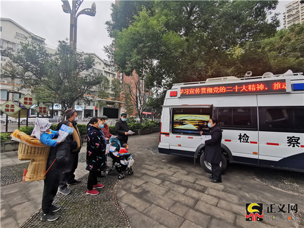 12月2日,四川省瀘州市納溪區(qū)檢察院將“流動(dòng)檢察車”開(kāi)進(jìn)轄區(qū)院壩,結(jié)合宣講黨的二十大精神,向過(guò)往群眾播放憲法宣傳視頻、發(fā)放憲法宣傳資料。周茜 攝