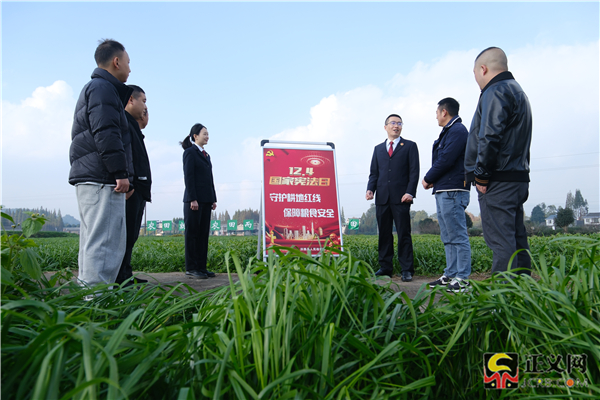 12月2日,四川省洪雅縣檢察院開(kāi)展“守護(hù)耕地紅線,保障糧食安全”普法宣講活動(dòng),將普法課送到田間地頭。圖為該院檢察干警與眉山市人大代表一起,在止戈鎮(zhèn)蓮花村高標(biāo)準(zhǔn)農(nóng)田區(qū),向蓮花村企業(yè)代表、村兩委干部進(jìn)行普法宣傳。鄧娟 攝