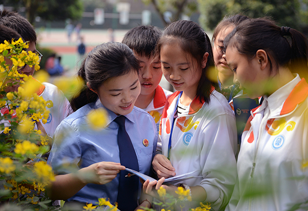 2020年10月15日,重慶市江津區(qū)檢察院青少年維權(quán)崗的“莎姐”檢察官們來到區(qū)田家炳中學,開展“普法開學季·‘莎姐’百校行”活動。活動中,檢察官們走進學生中,與學生開展交流互動,讓同學們在輕松愉快的氛圍中學到法律知識。江泳 攝