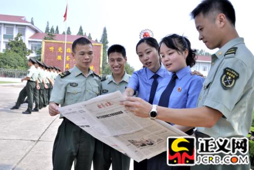正義網(wǎng)安徽六安 7月28日電(通訊員 劉發(fā)玉 文\黃策)安徽省六安市裕安區(qū)人民檢察院檢察官走進(jìn)軍營,親切慰問了南京軍區(qū)駐地某部官兵,并向官兵們介紹檢察機(jī)關(guān)近期所開展的工作。圖為檢察官與駐地官兵共閱《檢察日?qǐng)?bào)》的情形。