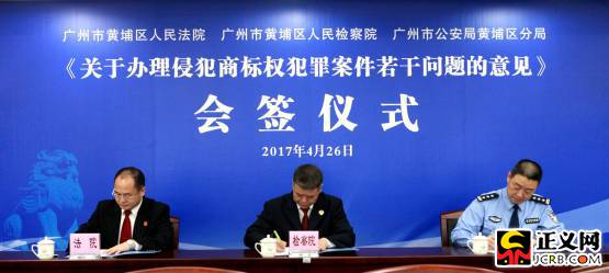 正義網(wǎng)廣州4月26日電(記者鐘亞雅 通訊員周園)今日是世界知識(shí)產(chǎn)權(quán)日,(2017年4月26日)上午,廣州市黃埔區(qū)人民法院、廣州市黃埔區(qū)人民檢察院、廣州市公安局黃埔區(qū)分局《關(guān)于辦理侵犯商標(biāo)權(quán)犯罪案件若干問題的意見》(以下簡(jiǎn)稱《意見》)聯(lián)簽儀式在廣州市黃埔區(qū)人民檢察院舉行。該意見將在三單位聯(lián)簽后正式印發(fā),并指導(dǎo)一線公檢法辦案干警的實(shí)際工作。