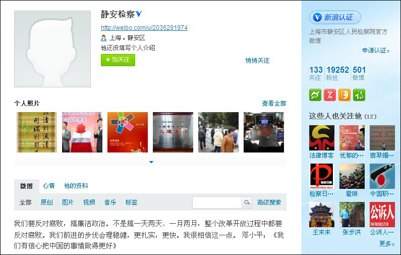 要把網(wǎng)絡(luò)作為檢察宣傳的新陣地 打造以官方網(wǎng)站為主、官方微博為輔的一體式宣傳模式。注重綜合運用文字、照片、漫畫、視頻、PPT等形式,搭建一個釋檢情、聊民意、解民惑的溝通平臺,充分發(fā)揮“點對點交流、鍵對鍵溝通”的優(yōu)勢,把握好輿情引導(dǎo)的主動權(quán),努力提升檢察工作的公信力和群眾滿意度。我院已先后在新浪、騰訊、東方網(wǎng)等主流網(wǎng)站開設(shè)“靜安檢察”官方微博,粉絲眾多。