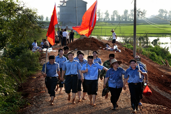 2012年6月,江西省豐城市清豐山河段潭鄉(xiāng)流域發(fā)現(xiàn)嚴(yán)重險(xiǎn)情,豐城市人民檢察院迅速調(diào)集院應(yīng)急小分隊(duì)與段潭鄉(xiāng)干部群眾一起參與防汛工作。圖為險(xiǎn)情排除后干警凱旋歸來的情景。