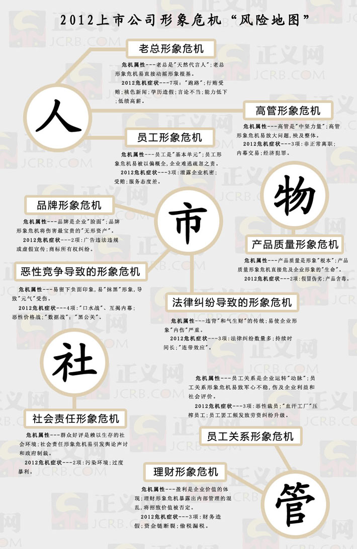 上市公司形象危機(jī)是指上市公司由于各種因素引發(fā)的負(fù)面形象和社會惡劣影響。中國人民大學(xué)危機(jī)管理研究中心唐鈞主任,在社科院藍(lán)皮書《形象危機(jī)應(yīng)對研究報告2012(企業(yè)篇)》(社會科學(xué)文獻(xiàn)出版社)的基礎(chǔ)上,通過對2012年度上市公司形象危機(jī)典型案例庫的研究形成該報告。