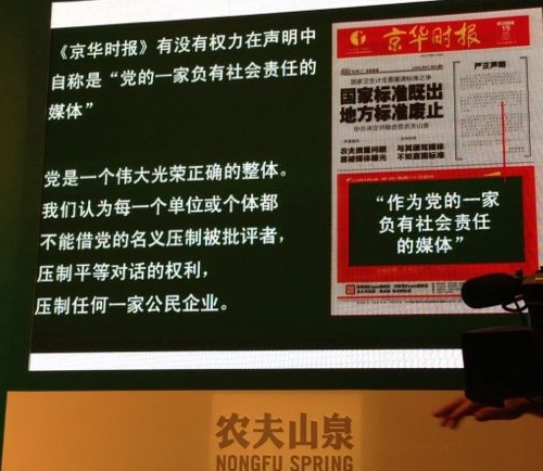 | 昨日,農(nóng)夫山泉就近期“標(biāo)準(zhǔn)門”問題舉行新聞發(fā)布會,稱產(chǎn)品同時執(zhí)行浙江質(zhì)量標(biāo)準(zhǔn)和強(qiáng)制執(zhí)行國家安全標(biāo)準(zhǔn),農(nóng)夫山泉執(zhí)行地標(biāo),不等于只執(zhí)行地方標(biāo)準(zhǔn)。發(fā)布會現(xiàn)場農(nóng)夫山泉與《京華時報(bào)》針鋒相對互不相讓,“標(biāo)準(zhǔn)門”事件似乎愈演愈烈。 |