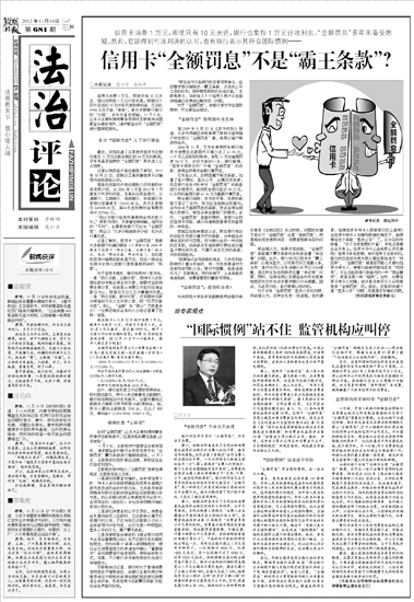 推薦詞:信用卡消費1萬元,即使只有10元未還,銀行仍然按1萬元計收利息,已還的9990元也要繼續(xù)交納利息和滯納金。這一“行規(guī)”,備受質疑,卻難以改變。本報抓住山東律師請求銀監(jiān)會整頓這一新聞跟蹤報道,緊追不舍。同時采訪法律專家,由多名專家從專業(yè)角度剖析“行規(guī)”違法之所在。先后用兩個版面,多篇文章給予報道,形成輿論攻勢。此后,銀監(jiān)會就相關問題作出答復,銀行業(yè)對此進行整改。本報報道,推動了這一“霸王條款”的廢除。 文章被多家網站轉載。