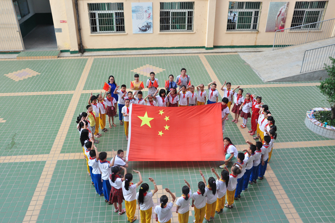 國慶前夕,福建省順昌縣檢察院青年檢察官志愿者來到該縣水南中心小學,開展愛國主義教育。圖為青年檢察官與孩子們圍成心形,向國旗敬禮。