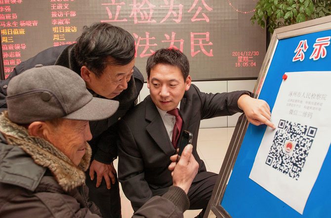 12月30日,河北省涿州檢察官在幫助來訪群眾掃描檢務公開微信二維碼。近來,涿州市檢察院開通了微信,微信中詳細展示了檢察機關的性質(zhì)、任務和職責,并對如何舉報職務犯罪進行了說明,有效的加強了與人民群眾的聯(lián)系和構通。