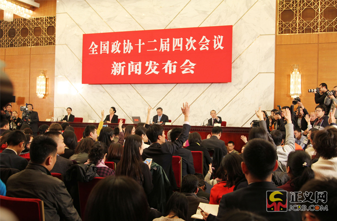 3月2日下午,全國政協(xié)十二屆四次會議新聞發(fā)布會在人民大會堂舉行,大會新聞發(fā)言人王國慶向中外媒體介紹本次大會有關(guān)情況并回答記者提問。正義網(wǎng)記者徐伯黎攝
