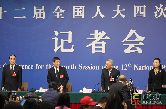 3月10日,全國人大內(nèi)司委副主任委員王勝明、全國人大財經(jīng)委副主任委員烏日圖、全國人大環(huán)資委副主任委員袁駟、全國人大常委會法工委副主任鄭淑娜就“人大立法工作”的相關(guān)問題回答中外記者的提問。正義網(wǎng)記者徐伯黎 攝