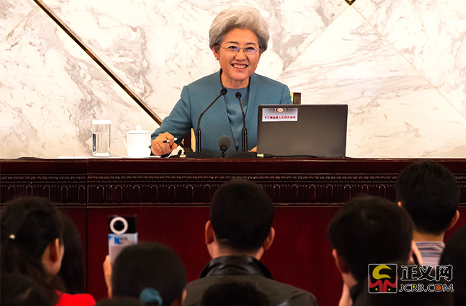 3月4日,十二屆全國人大四次會議在人民大會堂舉行新聞發(fā)布會,大會發(fā)言人傅瑩回答中外記者的提問。本次發(fā)布會共有18名中外記者提問,其中11位記者提問涉及法治話題,占提問總數的61%。民法典的編纂工作、慈善法、推進全面依法治國、全國人大審議境外非政府組織管理法草案、全國人大立法、反腐敗、《中華人民共和國反家庭暴力法》、稅收法、涉黃涉毒或者微博禁言的演員、政府依法行政、《大氣污染防治法》等。正義網記者程丁攝