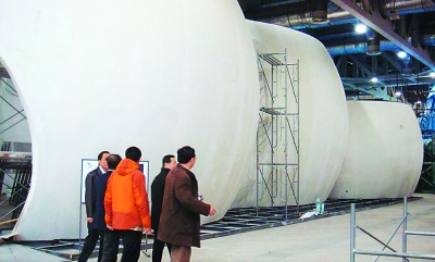 在山東館前,我們看見地面幾位工程師正在商量,上面的架子上幾位工人正在施工。王錦珍副會長向正在那里的施工負責人詢問進展情況,施工負責人回答說,我們施工進展很順利,這個月底就可以完工,并將很快轉(zhuǎn)入試運行。月底,省里的領導還將到這里來檢查。