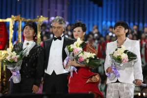 郎朗、波切利、宋祖英、周杰倫(左起)接受觀眾的熱烈掌聲