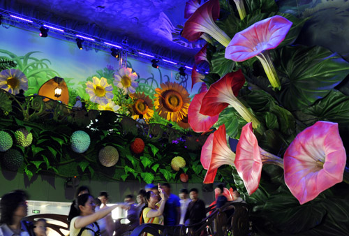 5月31日,在世博園俄羅斯館,參觀者徜徉于鮮花山谷般的童話世界。