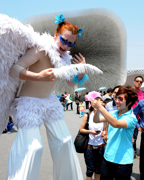 5月31日,世博園英國館的小丑演員與游客互動。