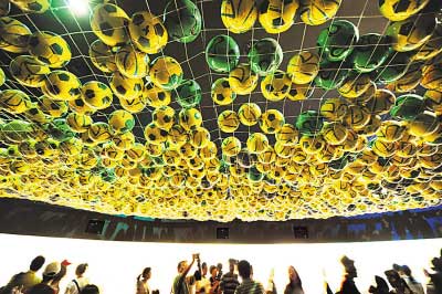 說起足球怎么可能少了巴西?作為唯一一個“全勤”參加了所有世界杯決賽并且5次捧杯的世界頭號足球強國,自然不會放過在世博會上展示他們足球文化的機會。更何況下屆2014年世界杯時,巴西人將成為東道主。巴西館整個建筑猶如一個綠色“翻版鳥巢”,與足球有關的元素隨處可見。展館正面的外墻上安裝了一臺巨大的液晶顯示屏,播放足球游戲畫面。進入展館,游客首先將走進一個環(huán)形屏幕放映廳中,最吸引眼球的不是畫面精致的影片,而是你抬頭就能發(fā)現的驚喜——用數百個足球鋪就的天花板。在這里,館方在天花板上安裝了一張巨大的網兜,并在其中塞進了數百個綠色、白色、藍色、黃色的足球,這些顏色也是巴西國旗的組成色。這一設計讓參觀者一進入展廳便能感受到足球王國的魅力。