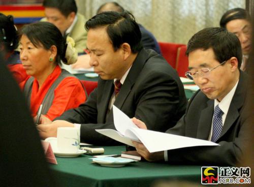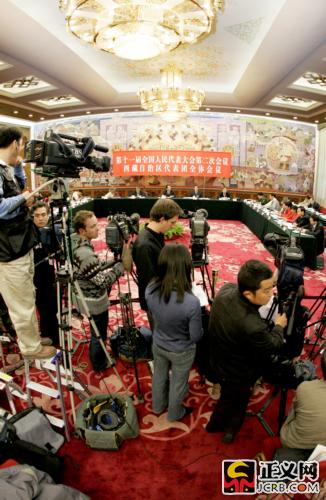3月6日下午,人民大會堂西藏廳,西藏代表團(tuán)在審議溫家寶總理代表國務(wù)院作的政府工作報告,百余名中外記者齊聚西藏代表團(tuán)會場。記者從西藏代表團(tuán)荻悉:目前,西藏社會穩(wěn)定,經(jīng)濟(jì)發(fā)展,人民安居樂業(yè),生活富足…… 傅偉攝