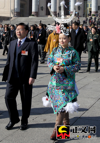 3月4日上午,十一屆全國(guó)人大四次會(huì)議召開(kāi)預(yù)備會(huì)。貴州代表雷阿幼朵身著民族服裝走出會(huì)場(chǎng)。傅偉/攝