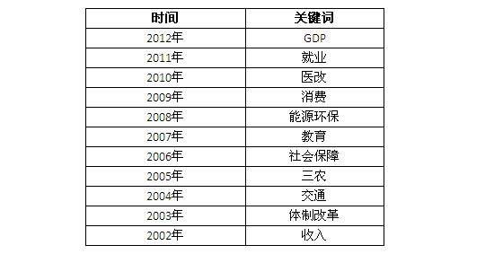 致十年——全國兩會政府工作報告回顧:該欄目分別回顧了從2002-2012這十年間兩會關(guān)鍵詞的主題變化,詳情如下: