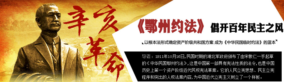 1911年10月28日,宋教仁與黃興一同抵達(dá)武漢。此時(shí)清軍逼近,漢口危在旦夕,黃興一心所系是打退清兵,先立戰(zhàn)功,再作其他打算;而宋教仁的著眼點(diǎn)則在“立”,他力主組織中央臨時(shí)軍政府,以取得交戰(zhàn)團(tuán)的合法地位。一番努力沒有成功,宋教仁便轉(zhuǎn)向以建設(shè)新國家為宗旨的立法活動,以其精湛的法學(xué)知識及長期充分的積累準(zhǔn)備,在短短的時(shí)間之內(nèi)起草了《中華民國鄂州臨時(shí)約法》(簡稱《鄂州約法》)。