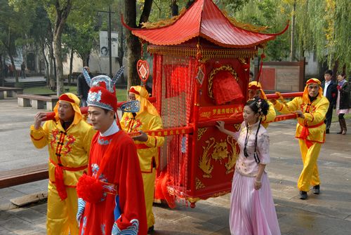 諸暨婚俗歷史比較久,很多東西保存的好,像現(xiàn)在紹興和杭州都沒(méi)這么講究了。十分講究行郎的威儀。一頂八抬花轎,兩側(cè)各有身著清一色長(zhǎng)衫的六名行郎壓陣保駕。行郎由男方延請(qǐng),在吹吹打打的迎親中,他們手提轎燈,前呼后應(yīng),顯得特別招眼,把男方炫耀虛榮的戲唱足了。