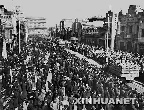 資料圖片:1949年1月31日舉行北平入城式。人民解放軍在萬眾歡呼中進(jìn)入前門大街。新華社發(fā)