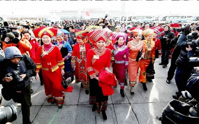 少數(shù)民族代表身著民族服裝步入會(huì)場(chǎng)。我國(guó)現(xiàn)行選舉法規(guī)定,人口特別少的民族至少應(yīng)有一名代表。國(guó)務(wù)院新聞辦去年9月27日發(fā)表的《中國(guó)的民族政策與各民族共同繁榮發(fā)展》白皮書顯示,我國(guó)歷屆全國(guó)人民代表大會(huì)中,少數(shù)民族代表人數(shù)占全國(guó)人民代表大會(huì)代表總?cè)藬?shù)的比例,均高于同期少數(shù)民族人口占全國(guó)總?cè)丝诘谋壤?/p>