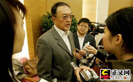 在北京市代表團審議休息時,柳傳志代表接受記者采訪。傅偉 攝