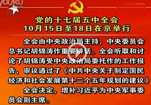 時(shí)間:10月15日-18日 地點(diǎn):北京 議程: ·政治局向中央委員會(huì)報(bào)告工作·研究關(guān)于制定國民經(jīng)濟(jì)和社會(huì)發(fā)展第十二個(gè)五年規(guī)劃的建議