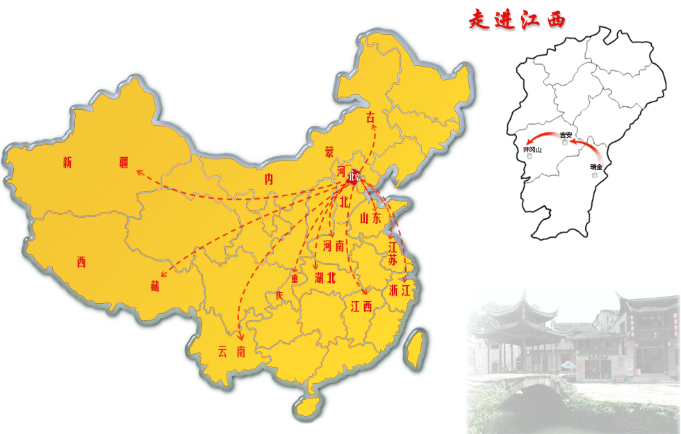 瑞金,位于江西省東南邊陲,因地產(chǎn)黃金,金為瑞,故名。江西瑞金是一片具有光榮革命歷史的紅土地。20世紀30年代,中國共產(chǎn)黨領導創(chuàng)建以瑞金為中心的中央革命根據(jù)地(中央蘇區(qū))。井岡山既是一個旅游勝地,亦是一處革命圣地。從這里燃起的星星之火,后來蔓延成熊熊烈焰,最后紅遍了全中國。