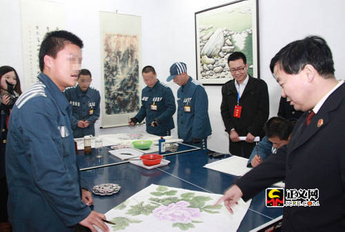 正義網(wǎng)記者與三門峽市檢察院駐硤石監(jiān)獄檢察室相關(guān)負(fù)責(zé)人觀看服刑人員藝術(shù)作品。姚宇/攝