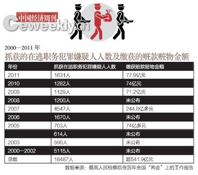 《中國經(jīng)濟周刊》從最高檢歷年“兩會”上的工作報告整理得知,自2000年底最高檢會同公安部組織開展追逃專項行動以來,至2011年,檢察機關共抓獲在逃職務犯罪嫌疑人18487名。而據(jù)最高檢公開發(fā)布的2005、2007、2009—2011年五年的數(shù)據(jù)顯示,我國這五年共繳獲贓款贓物金額達到541.9億元。